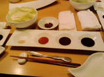 上が味噌、左下から塩、醤油、辛子入りソース、ソース。